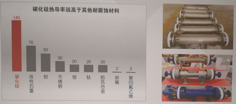 碳化硅热导率是改性石墨的2倍,金属钽的2- -3倍,不锈钢的4- 5倍, 哈氏合金的7倍,搪瓷、玻璃的数十倍同样换热效率”下使用更少的换热面积,允许更小的换热器尺寸,大大降低了占用空间,降低使用成本